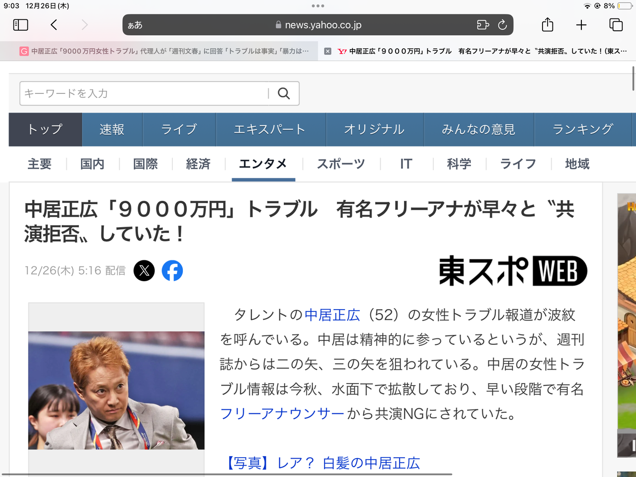 【芸能】中居正広「9000万円」女性トラブル 有名フリーアナが早々と〝共演拒否〟