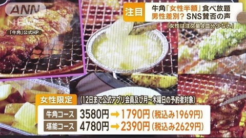 【牛角】食べ放題「女性半額」 SNSでは賛否