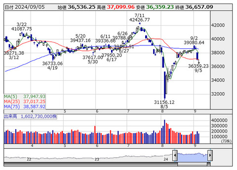 【日経平均】終値 265円安3万6391円 4営業日連続下落