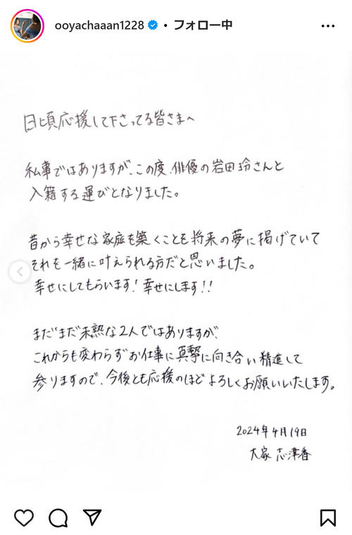 大家志津香、俳優の岩田玲との結婚をインスタグラムで発表!