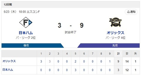 パ・リーグ F 3-9 B [5/23] オリックス 打線爆発で2季ぶり同一カード3連敗を阻止