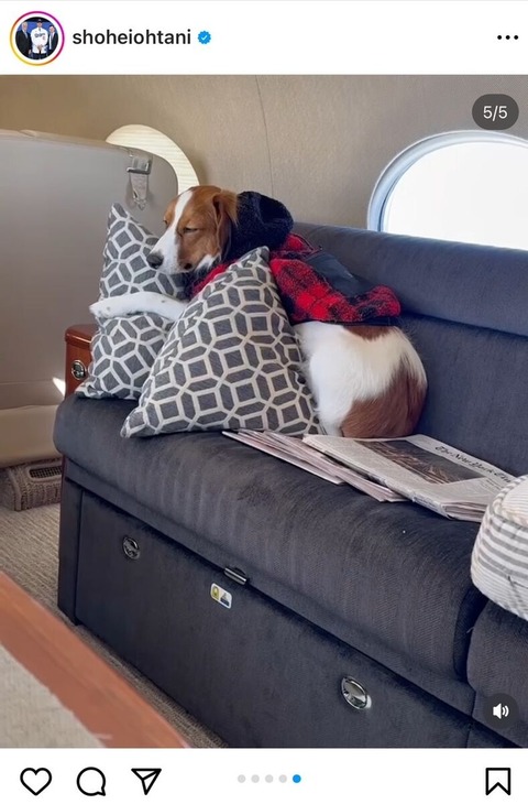 大谷翔平の愛犬デコピン、チャーター機で気持ちよさそうにお寝んね