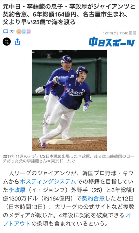 【イ・ジョンフ】元中日・李鍾範の息子・李政厚がジャイアンツと契約合意、6年総額164億円【イケメン・なんG、ちなDの反応】