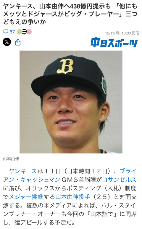 【MLB】ヤンキース、山本由伸と対面交渉 438億円提示も 「他にもメッツとドジャースがビッグ・プレーヤー」 三つどもえの争いか 【大谷翔平とライバルか同僚か】
