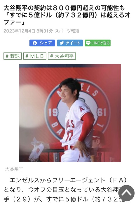 【MLB争奪戦】大谷翔平の契約は800億円超えの可能性も「すでに5億ドル(約732億円)は超えるオファー」