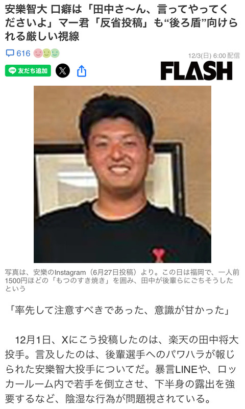 田中将大が謝罪も…拭えないもう一人の〝ヤバイ人〟安楽智大パワハラ問題 若手に心身の負担「厄介で絡むの辛い」