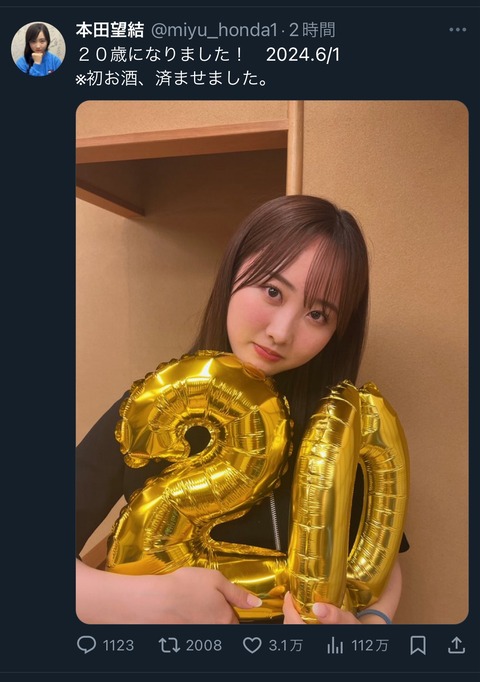 【悲報】我らが本田望結ちゃん、初お酒を済ませてしまうwwwwwwww