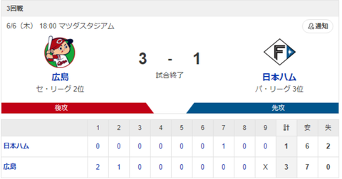 【広島vs.日本ハム 3回戦 】1(三)郡司裕也 2(遊)水野達稀 3(左)水谷瞬 4(捕) 田宮裕涼