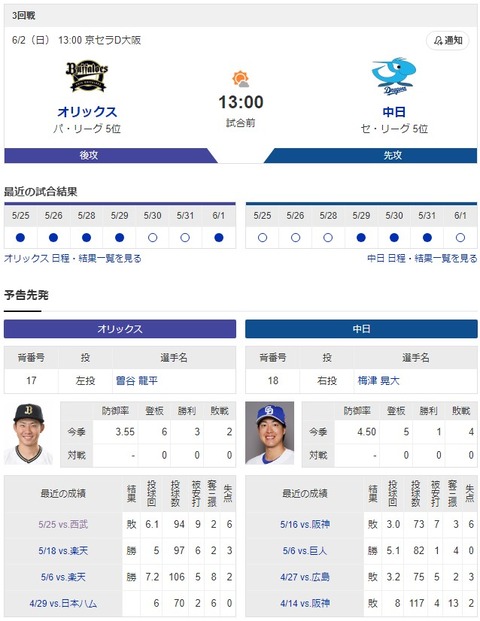 【オリ実況】オリックス 対 中日(京セラ)[6/2]13:00~