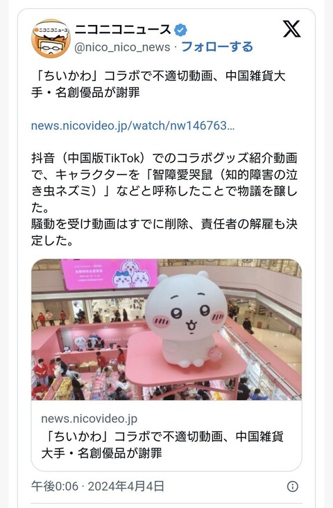 中国雑貨大手の名創優品が『ちいかわ』に関する不適切動画を流しに謝罪【驚愕】