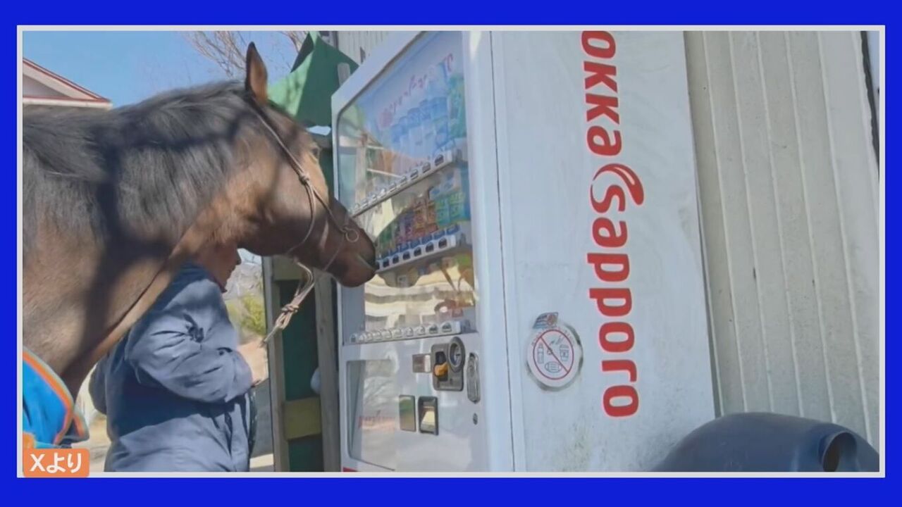 自販機でおすすめジュースを選ぶ、引退馬アカカゲくん「ボタンを押したらジュースが出ることを理解しているようです」