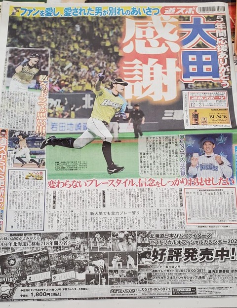 【野球】ハム退団の大田泰示さん、北海道新聞の一面