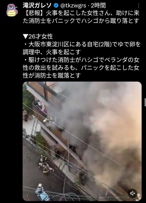ゆで卵火災、パニック女性が消防士の梯蹴落とし落下にネット騒然