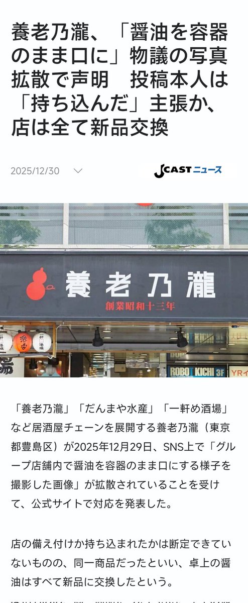 【食テロ】養老乃瀧「醤油を容器のまま口に」物議の写真拡散で声明 投稿本人は「自身が持ち込んだ」主張!