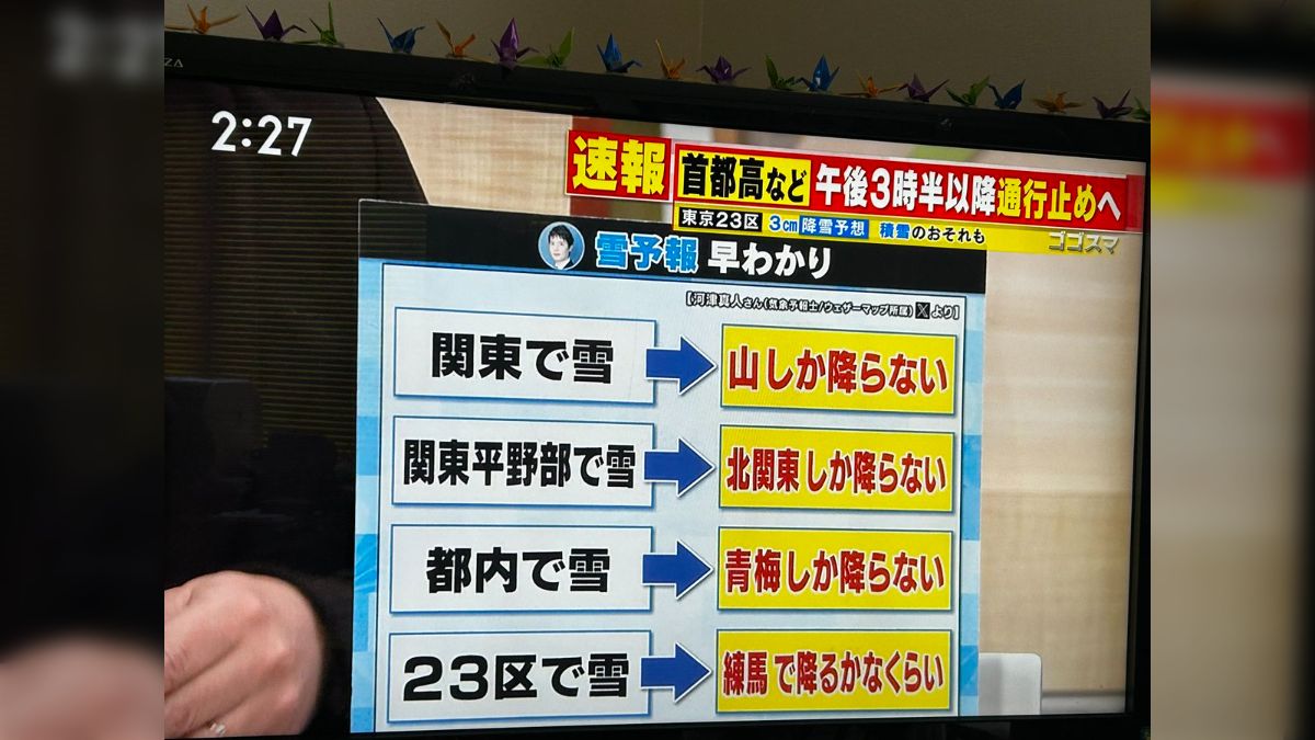 【雪】気象予報士「都内で雪→青梅しか降らない」「23区内で雪→練馬で降るかなくらい」「都心で雪→寒いだけ」 関東の雪予報あるあるに反響