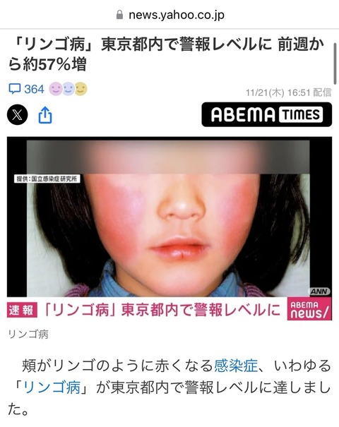 【リンゴ病】東京都内で警報レベルに!