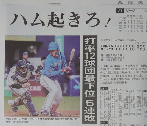 新庄日ハム 去年59勝81敗3分.423→今年1勝6敗.143