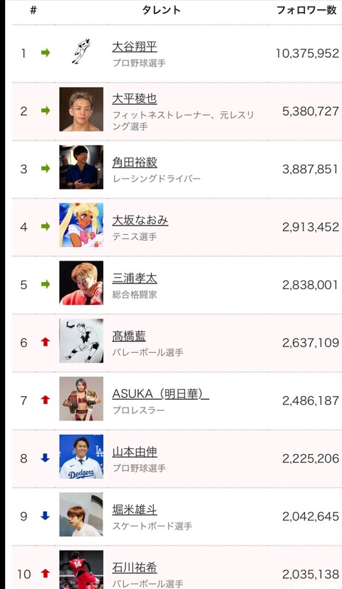 日本人スポーツ選手のインスタフォロワー数ランキング、すごい