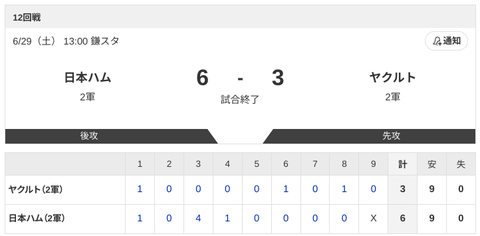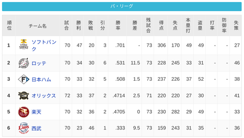 パ・リーグ 順位表 (6/29)