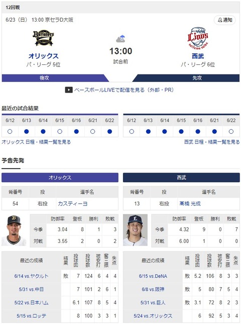 【オリ実況】オリックス 対 西武(京セラD)[6/23]13:00~