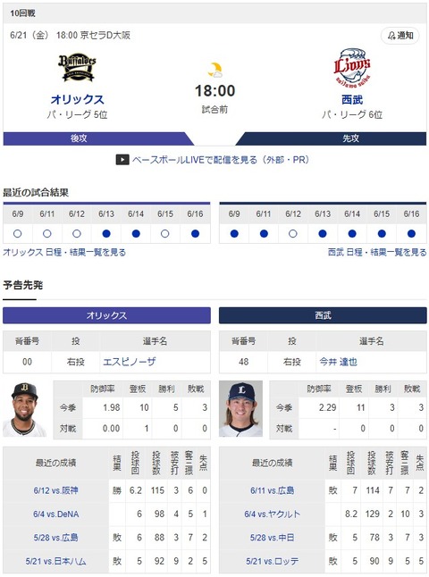 【オリ実況】オリックス 対 西武(京セラD)[6/21]18:00~