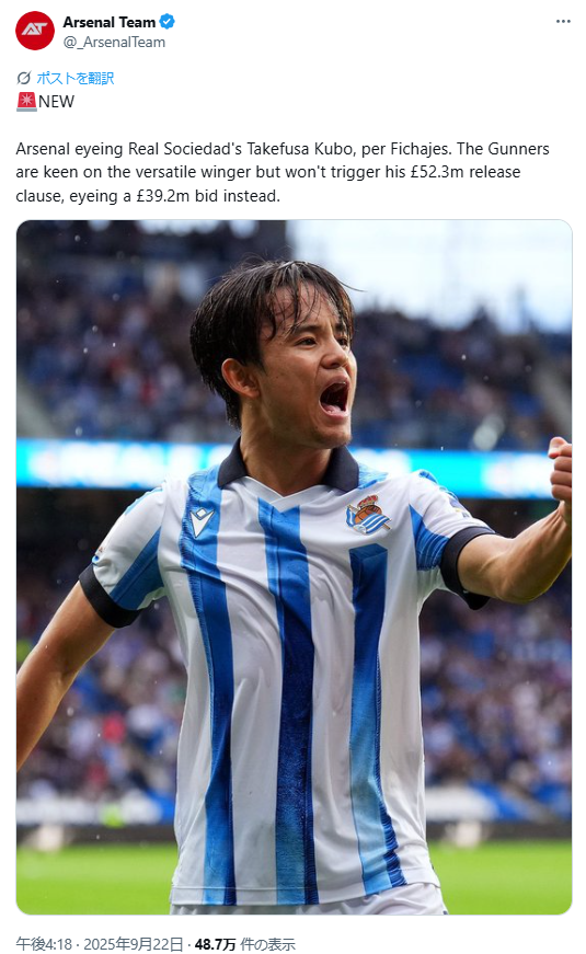 【速報】久保建英さん、アーセナル移籍の可能性…なお問題は契約解除金wwwww