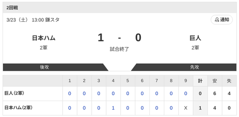 【2軍日ハムvs.巨人】1-0で勝利!!