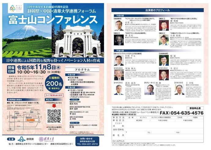 静岡県と中国清華大学「富士山コンファレンス」を開催 、福田康夫元首相のVMも
