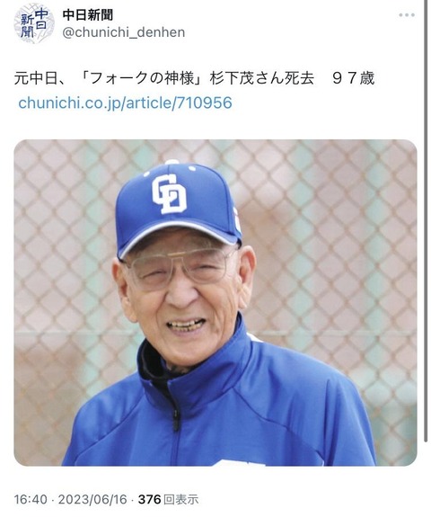 【訃報、重なる】杉下茂さん、死去。元中日ドラゴンズのエース、フォークボールの神様 球団初の日本一に貢献 97歳【ご冥福をお祈り致します】