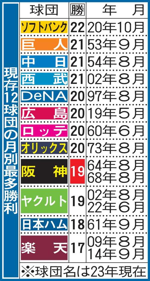 【データ】絶好調の阪神、月間2度の7連勝以上はリーグ55年ぶり2度目
