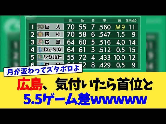 【爆笑】首位広島、いつのまにか首位と5.5ゲーム差に