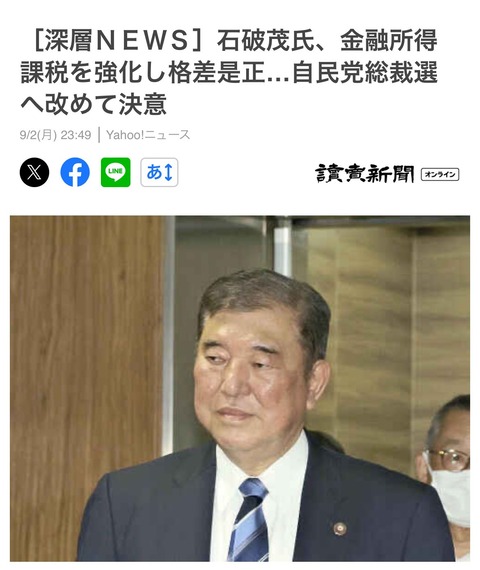 更に増税【自民党】「総裁になる気がない」石破茂氏「投資への課税強化」発言で突如吹き荒れる大逆風…100兆円吹っ飛ばした岸田首相の二の舞か