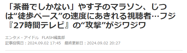 【24時間テレビ】「茶番でしかない」やす子のマラソン、じつは“徒歩ペース”の速度…フジ『27時間テレビ』の“攻撃”がジワジワ