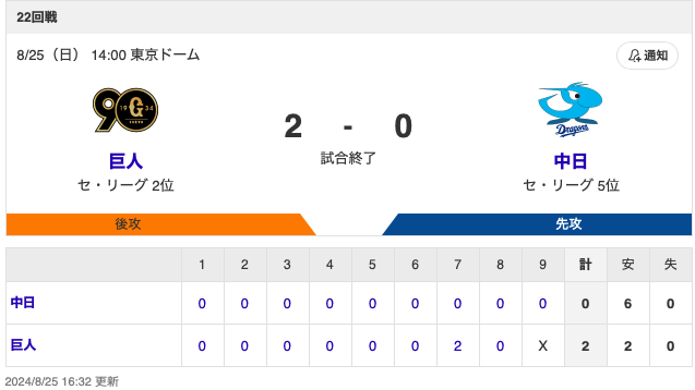 セ・リーグ 巨人 2-0 中日 [8/25] 巨人連勝 坂本5号2ランホームラン!菅野8回途中無失点12勝目 中日完封負けで連敗