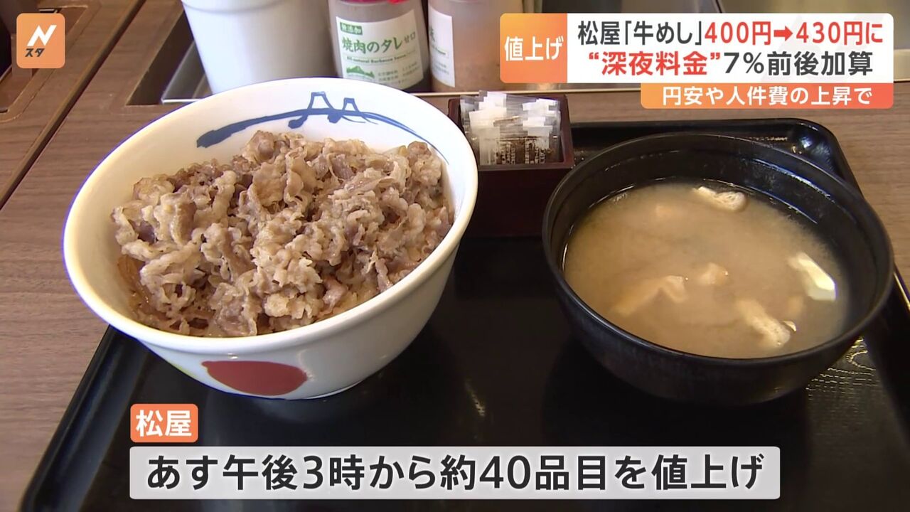【経済】松屋「牛めし」並盛400円→430円に値上げへ、深夜料金も導入、22時~午前5時まで約7%上乗せ