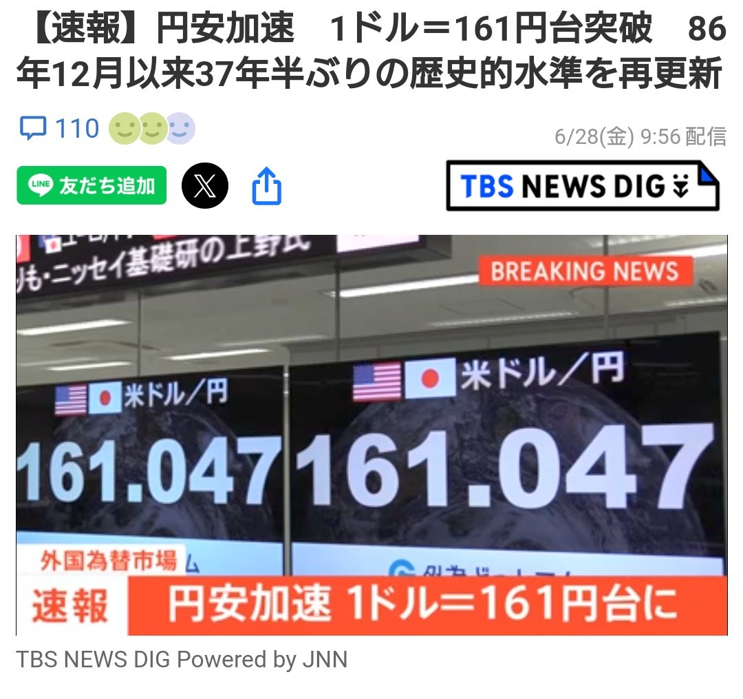 円安加速 1ドル=161円台突破 86年12月以来37年半ぶりの歴史的水準を再更新