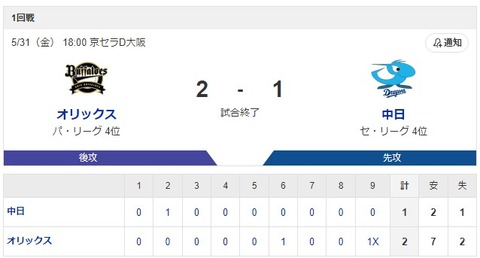 交流戦 B 2x-1 D [5/31] オリックス宗の犠飛でサヨナラ勝ち!連勝!!