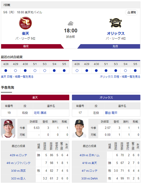 【オリ実況】楽天 対 オリックス(楽天モバイル)[5/6]18:00~